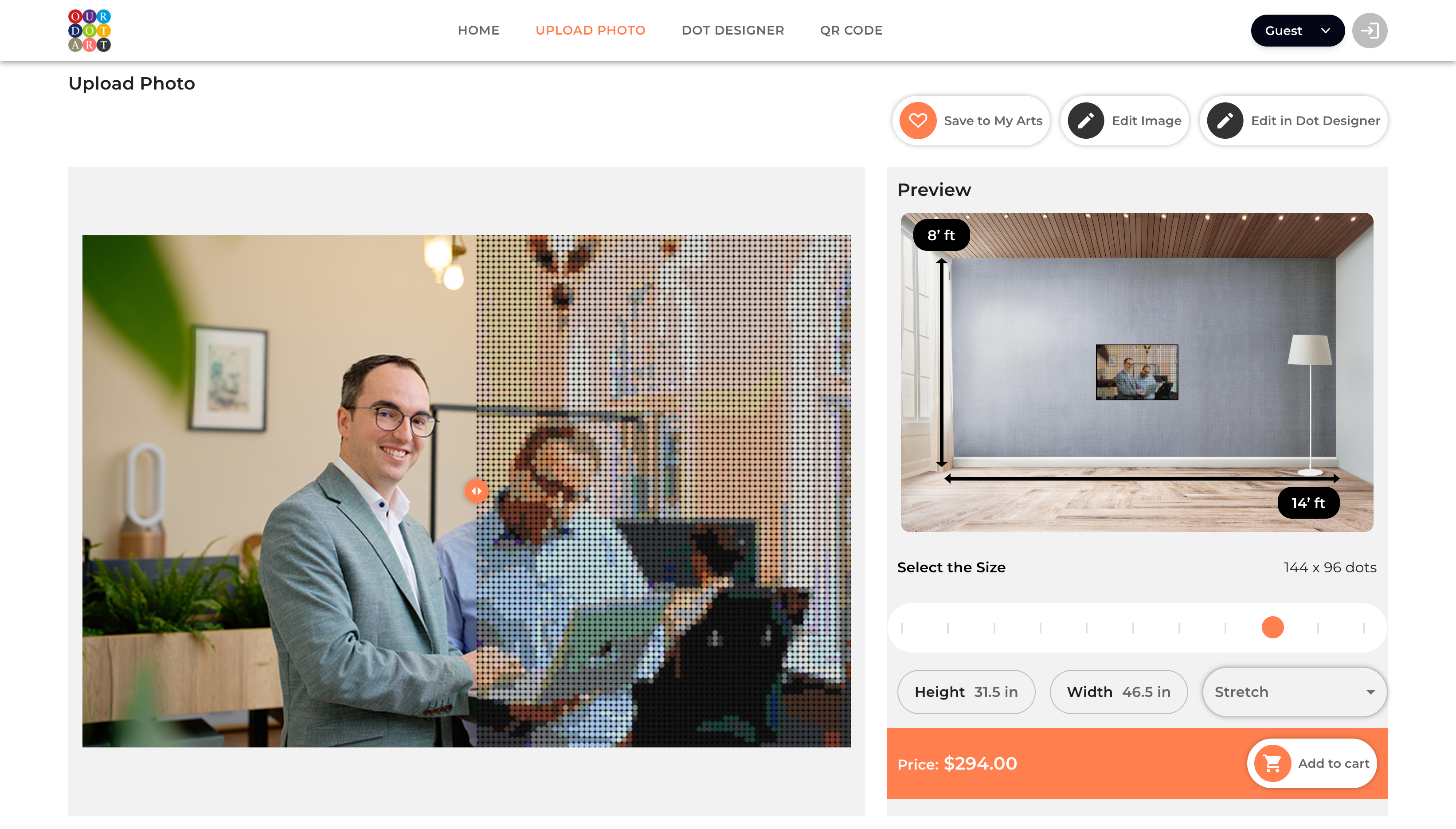 A web platform for transforming photos into unique dot art pieces, featuring a custom dot design tool and QR code integration.